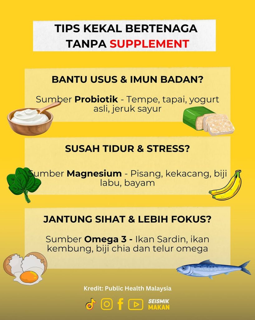 - Omega-3: Ikan kembung, salmon, atau biji chia. Ia mengurangkan keradangan dalam badan yang sering menyebabkan rasa lesu.