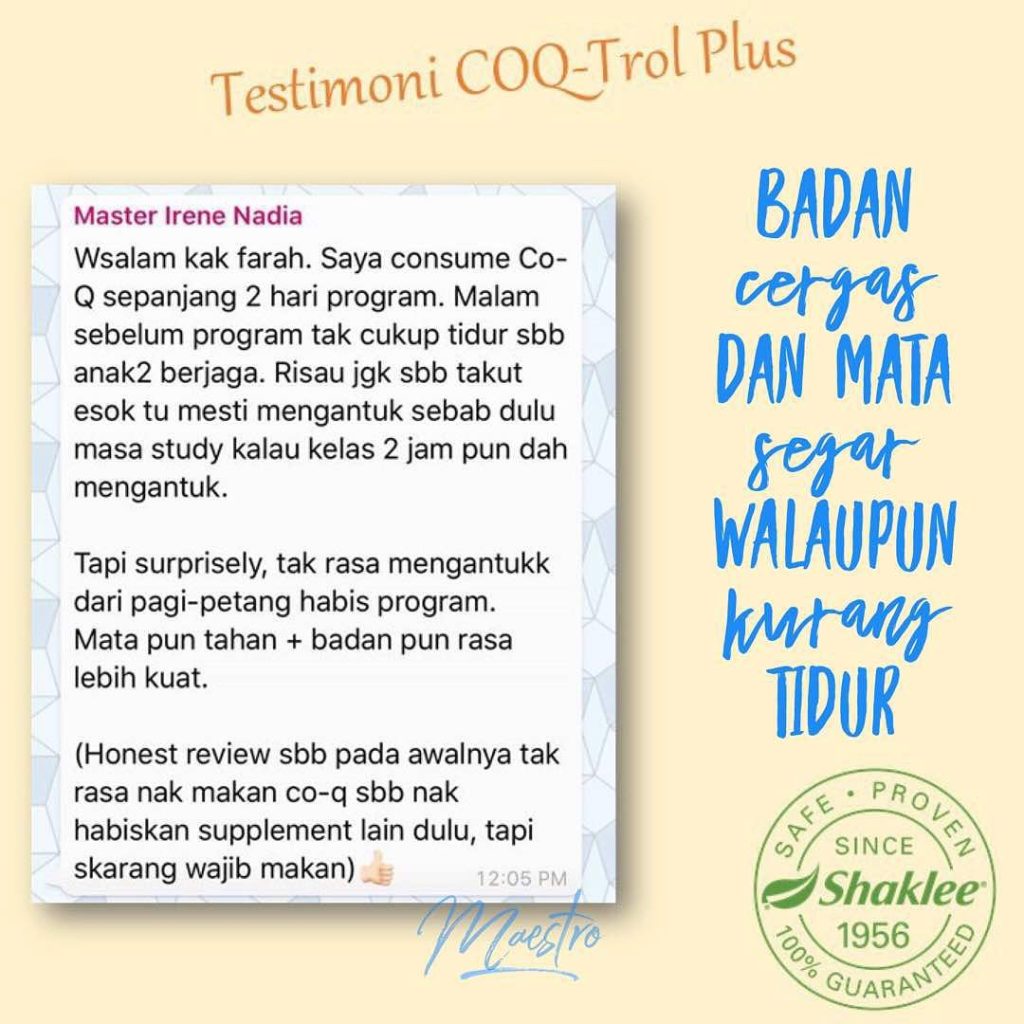 - Kaitan dengan Mengantuk: Jika sel badan anda tidak cekap menghasilkan tenaga, anda akan sentiasa letih. CoQTrol membantu jantung mengepam darah dengan efisien dan meningkatkan tenaga pada peringkat selular. Sangat disarankan untuk mereka yang sentiasa lesu walaupun cukup tidur.