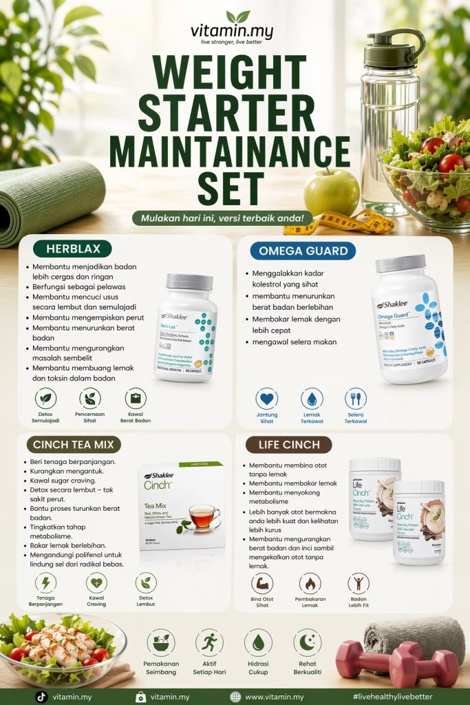 Lengkapkan perjalanan kesihatan anda dengan sokongan nutrisi yang tepat. Produk Shaklee seperti Herblax dan Omega Guard, bersama Set Kurus Shaklee yang komprehensif, boleh menjadi rakan perjalanan yang membantu badan anda berfungsi pada tahap optima — dari dalam ke luar.