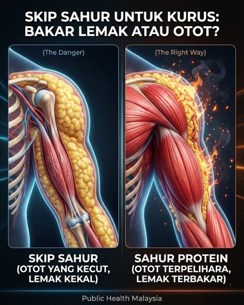 Fenomena “berat naik mendadak masa raya” berlaku kerana kehilangan otot semasa puasa. Jika anda skip sahur, badan akan memecahkan protein otot untuk mendapatkan tenaga melalui proses glukoneogenesis.